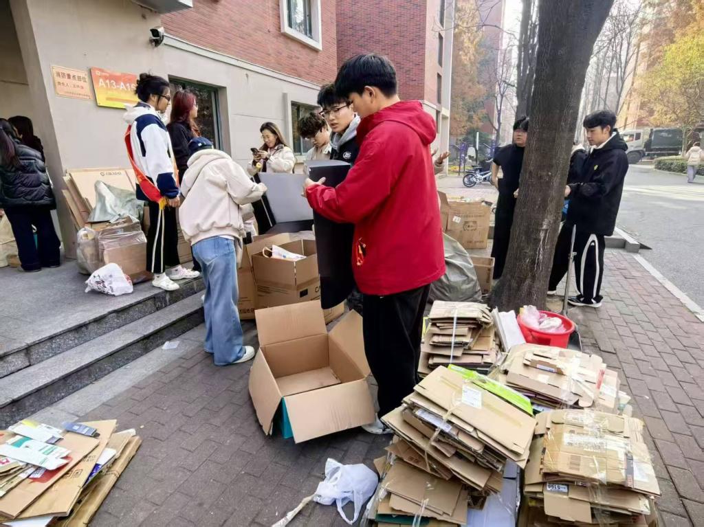 活动当天,志愿者们早早来到活动现场,设立分类回收点。同学们积极响应号召,纷纷将收集到的塑料瓶、快递纸箱等可回收物带到现场。志愿者们分工协作,使用专业工具对回收物品进行细致分类和称重记录。经过三个多小时的辛勤工作,共收集塑料瓶13.4公斤、各类纸箱173公斤,所有回收物已统一运送至指定回收点进行处理,实现资源循环利用,工作人员根据所捐物品的多少进行评奖。活动结束后,参与师生自觉清理现场,展现了良好的环保素养。
