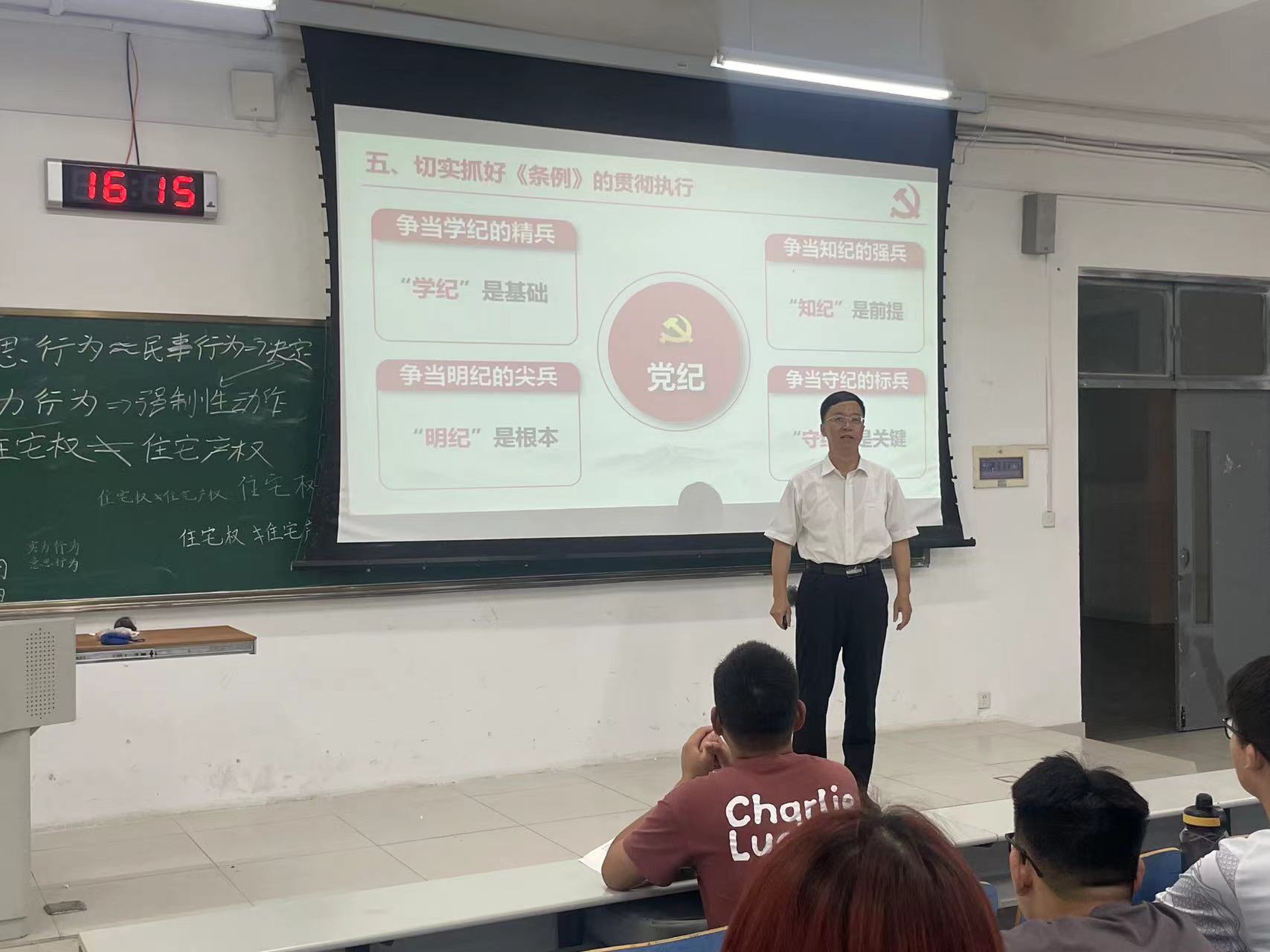 王斌围绕《中国共产党纪律处分条例》修订的背景、历次修订情况、修订的重要意义、主要内容和如何抓好贯彻执行等5个方面,结合学院教风、学风、工作作风建设,对《中国共产党纪律处分条例》作深入细致的解读。