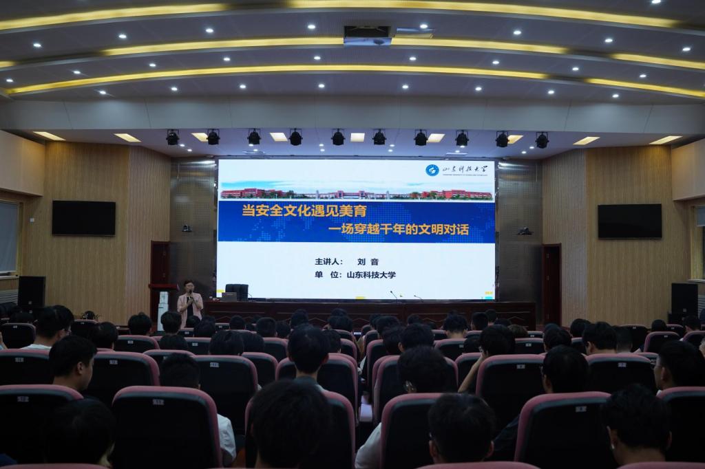 主讲人刘音,安全与环境工程学院教授、山东省教学名师,国家课程思政教学名师、全国黄大年式教师团队核心成员,安全工程专业主要负责人之一。刘老师从自身实际经历出发,强调安全文化教育的重要性,并巧妙衔接至更深层次的文化与美育思考。随后,刘音老师从汉字演变的视角,深入解析了“安”与“全”二字从从古至今的形态变化与文化内涵。她从历史维度梳理了安全文化的发展脉络,不仅涵盖中国古代的建筑防灾智慧、饮食卫生观念,还延伸至近代工业安全体系的建立,特别以杜邦企业的安全文化建设为例,说明现代企业如何将安全价值观融入组织行为中。刘老师强调,安全不仅是一种制度,更是一种文化、一种文明体现。讲座内容广泛而具象,从“安全文化与美食”谈到饮食健康与食品安全,从空气污染与水资源保护引申至环境美学与生态伦理,再到建筑安全中蕴含的结构美学与人文关怀——刘音老师以多学科交叉的视角,打破了传统安全教育的框架,展现出美育在塑造人的安全意识与文明素养中的深远意义。