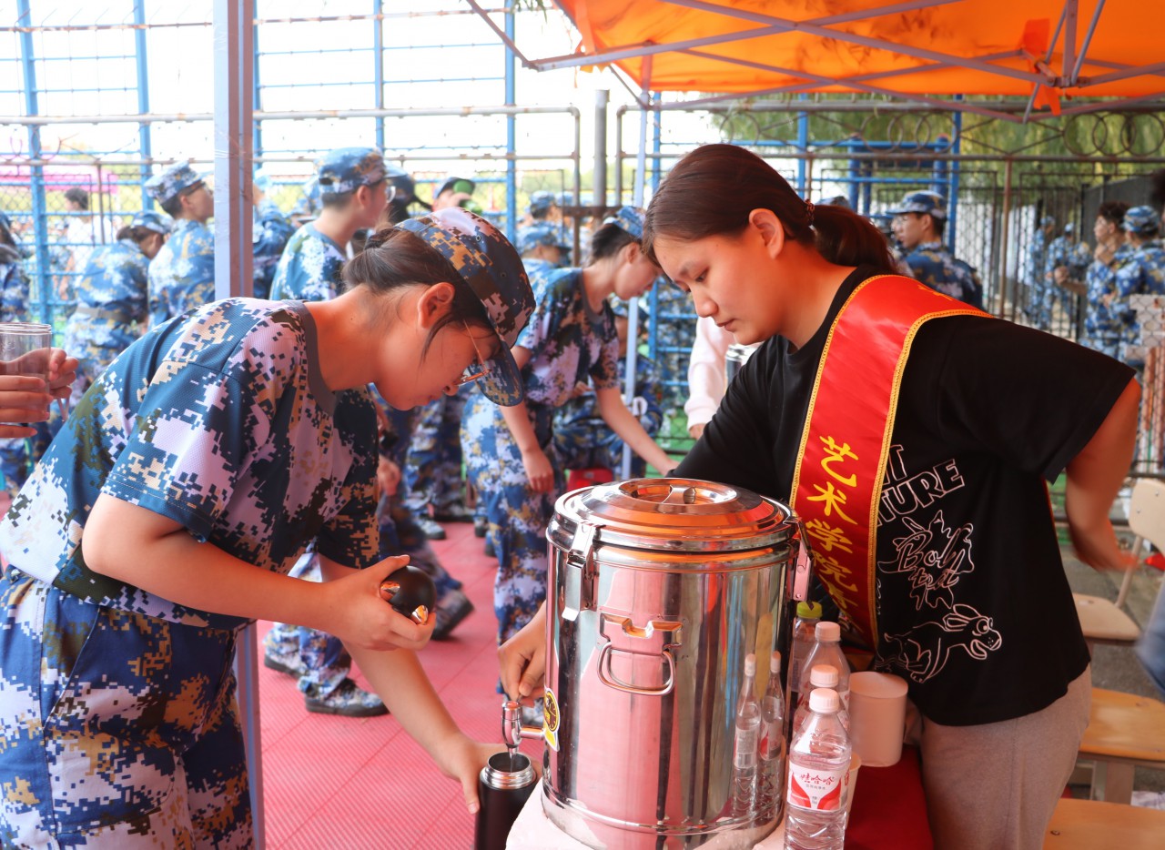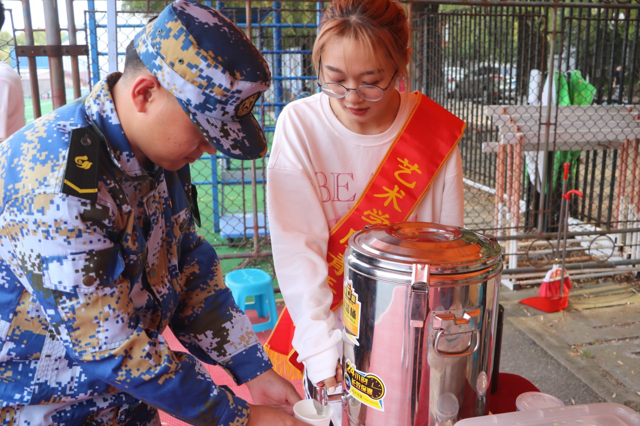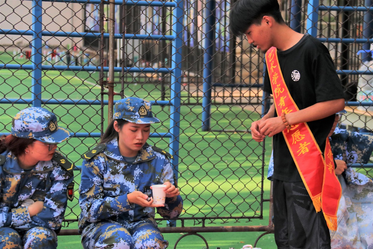 从入学到军训,志愿者们的身影就一直活跃在新生生活训练的各个角落。他们秉持着“奉献、友爱、互助、进步”的高尚精神,与新生们风雨相伴,共迎挑战。军训场地,志愿者们提前用保温桶为全体新生备好了充足的温水、贴心为新生们接水、为教官送去利喉药和茶水,缓解教官疲劳的嗓子。除此之外,志愿者还为同学们早早准备好齐全的防暑药品以及基本医疗物品,及时接应和照顾感到不适或中暑的同学。志愿者们牺牲了自己的休息时间,给新生带来细心的关怀与温暖,让新生更顺利地完成这场青春与热血的挑战。