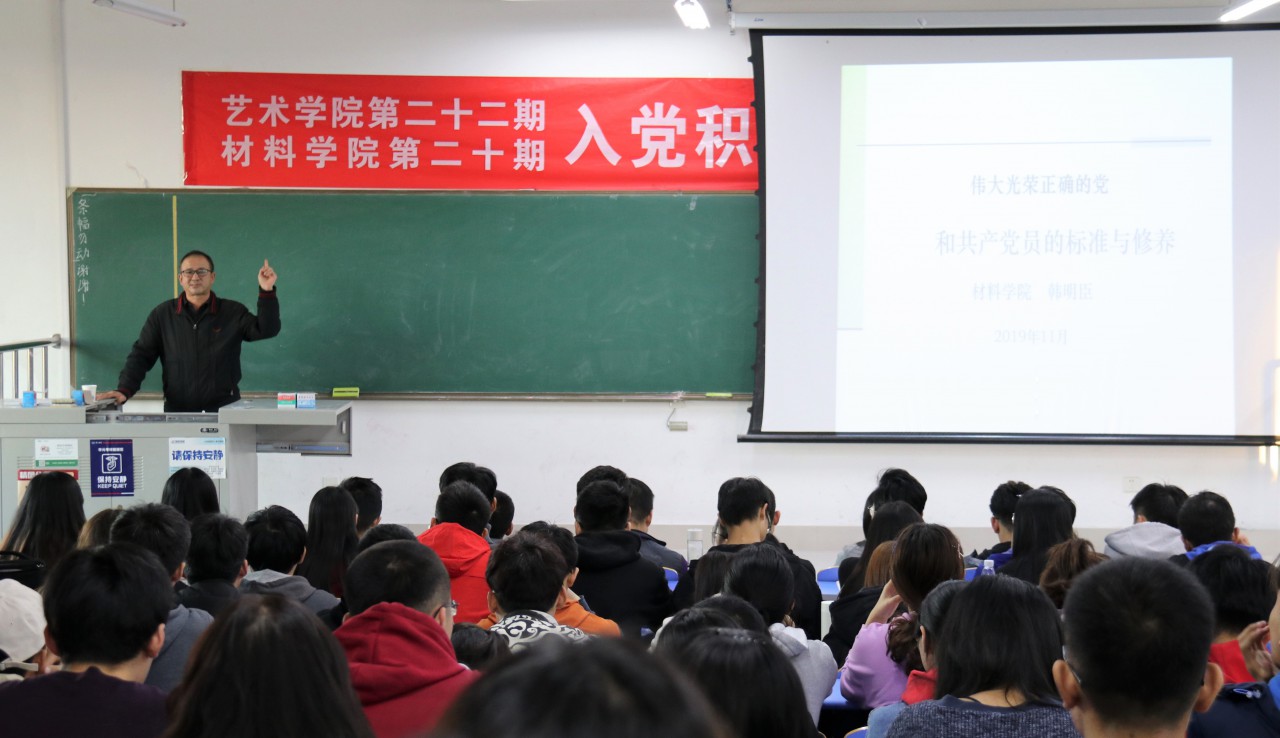 11月11日,材料学院党委副书记韩明臣为我院入党积极分子培训班讲授第三讲《党的性质、指导思想与最高纲领》。