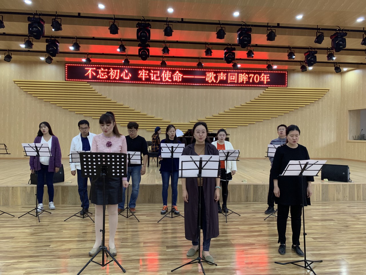 10月9日,由必赢3003no1线路检测中心党委主办,音乐系党支部承办的“不忘初心、牢记使命---歌声回眸70年 ”主题教育活动在多功能厅举行,音乐系全体教职工党员参加了此次活动,用歌声再现历史,用旋律谱写使命。