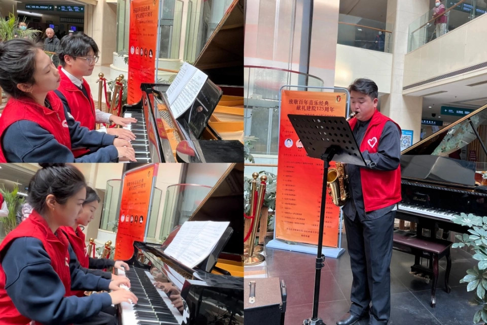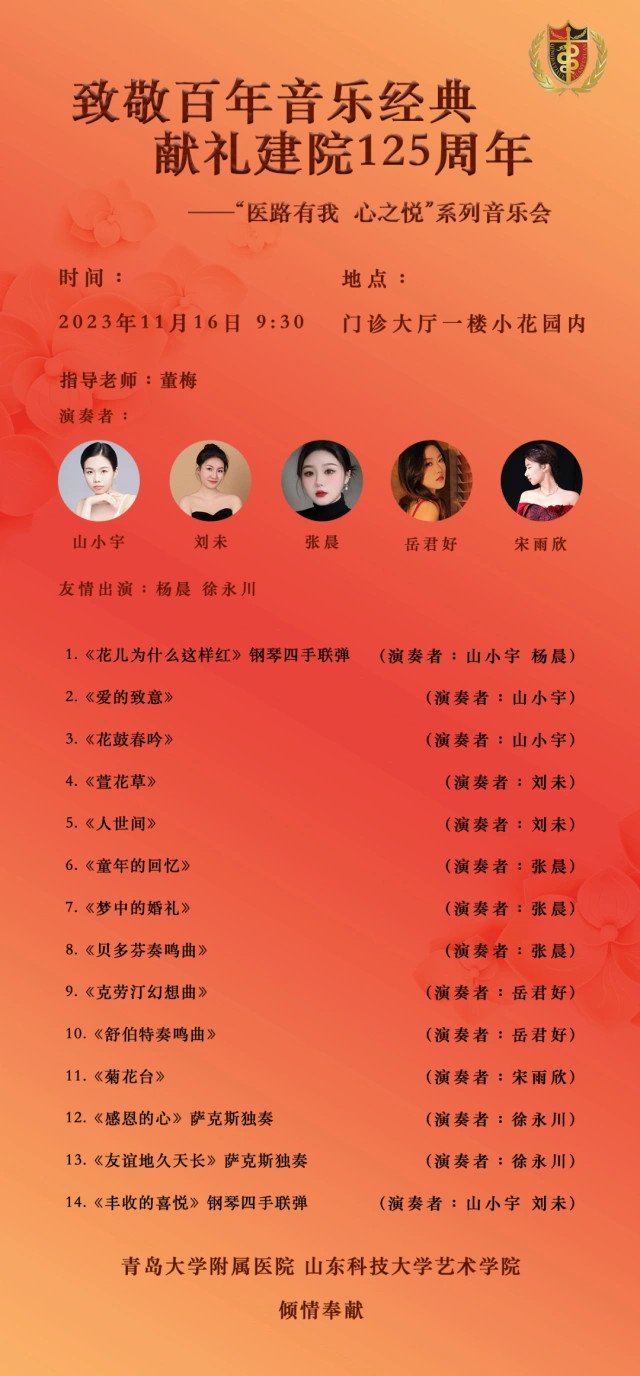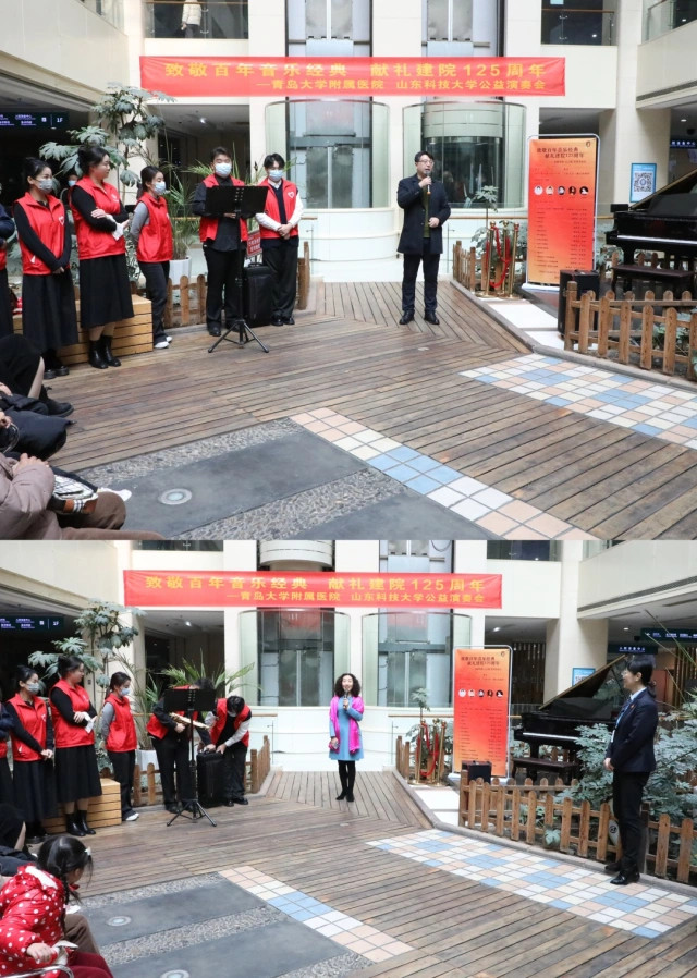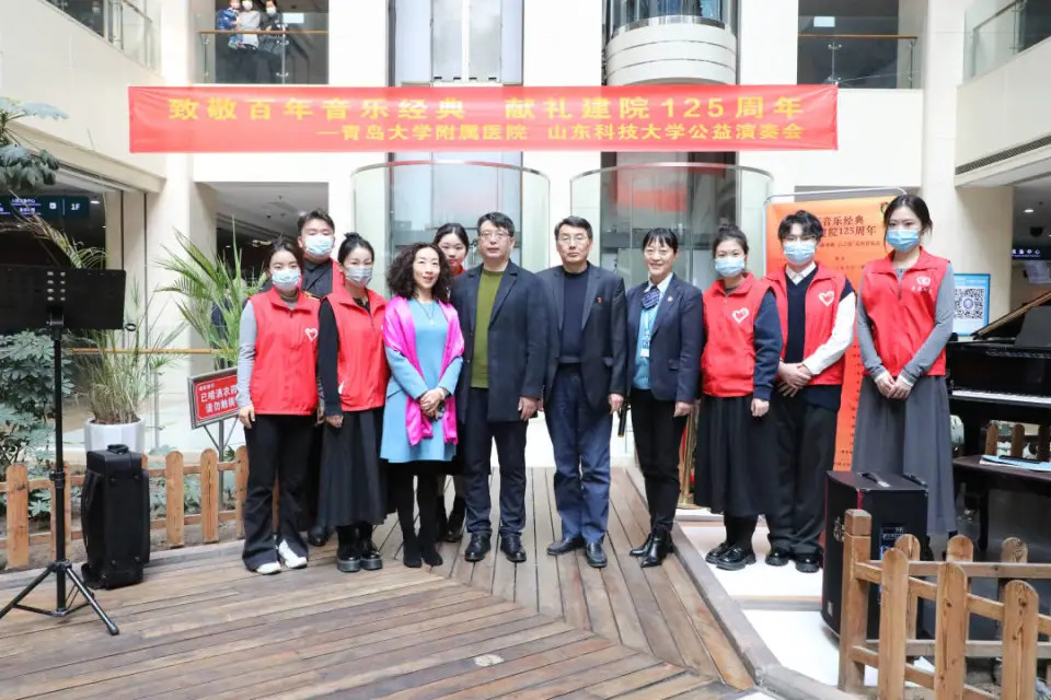 2023年11月16日上午,必赢3003no1线路检测中心与青岛大学附属医院——西海岸院区联合举办了“致敬百年音乐经典 献礼建院125周年”公益演奏会,演奏会于西海岸院区门诊大厅花园举办。