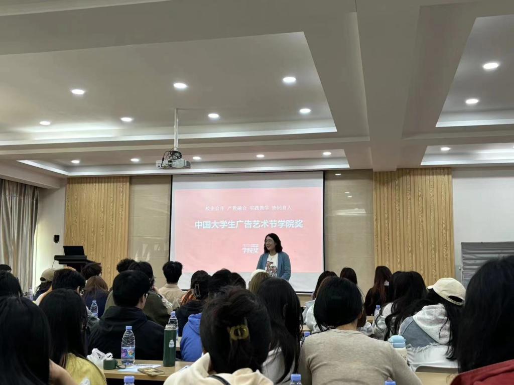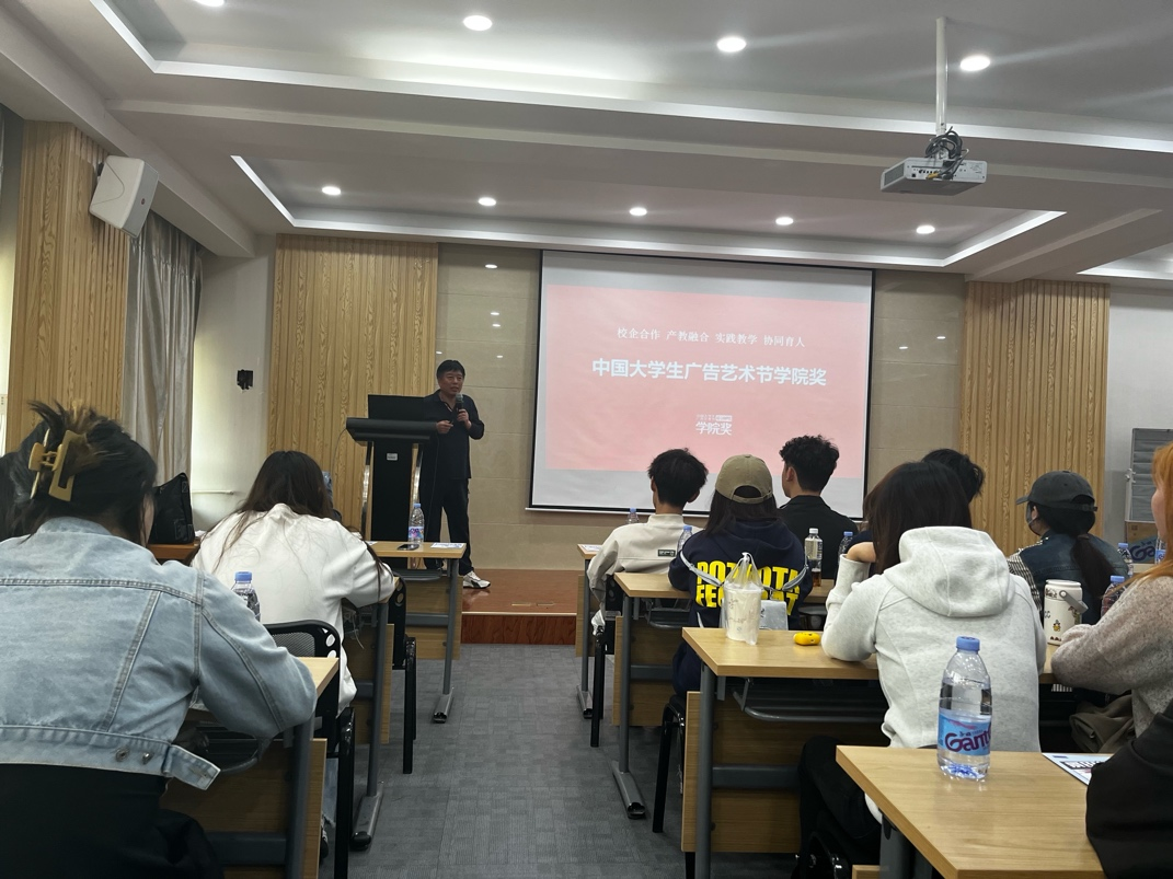 本次讲座由视觉传达设计系宋美音老师主持。首先,学院奖组委会主讲嘉宾,张书元先生通过历届获奖作品以及学院奖评奖标准,强调了策略创意在学院奖作品创作中的重要性,并鼓励同学们积极参与学院奖大赛,展示自己的才华。随后,学院奖组委会的主讲嘉宾,吕艺鸣女士,为在场的同学们详细介绍学院奖参赛流程以及注意事项,重点介绍快克、a2紫吨吨、毛戈平三个企业命题策略创意要点。