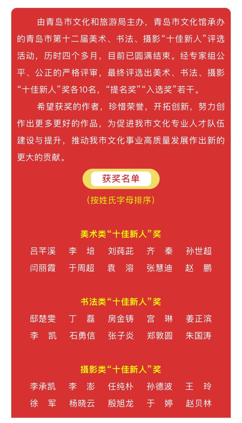 本次评选由青岛市文化和旅游局主办,青岛市文化馆承办,美术、书法、摄影十佳新人奖评选是青岛市推进艺术事业发展的重要举措之一,自1991年举办第一届美术“十佳奖”以来,每两至三年举办一次,旨在通过评比的方式创造一种永久性的选拔机制,发现和推出以青年为主体的艺术创作新秀。