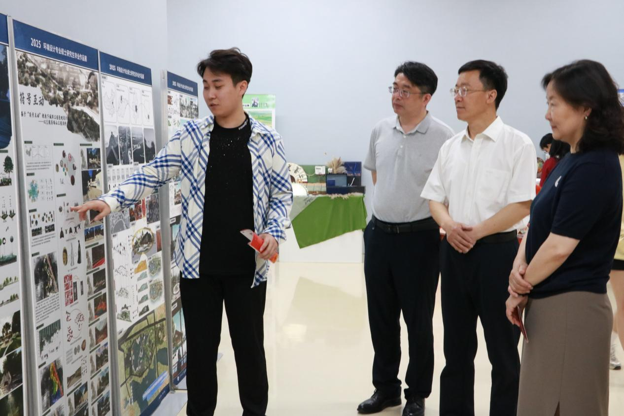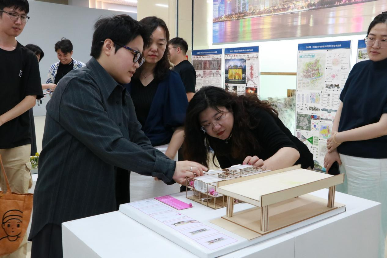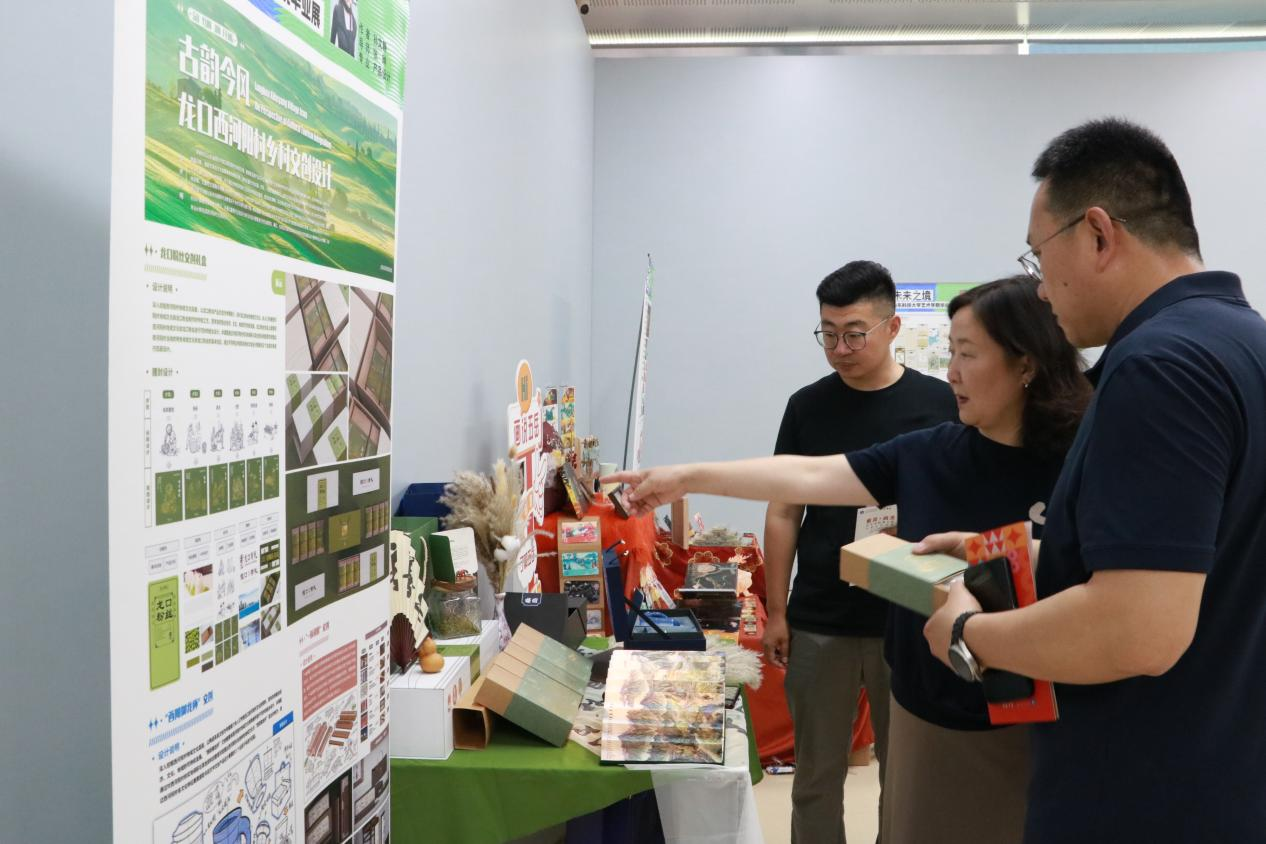 开幕式结束后,师生们一同移步展厅观展。本次展览以“未来之境”为主题,涵盖了视觉传达设计、环境设计、产品设计等多个专业的作品。同学们以信息语言解码、可持续空间构建、人与物共生关系重构为核心方向,聚焦可持续发展、人工智能与人类生活的交互等社会热点,体现了设计驱动下的未来发展趋势。