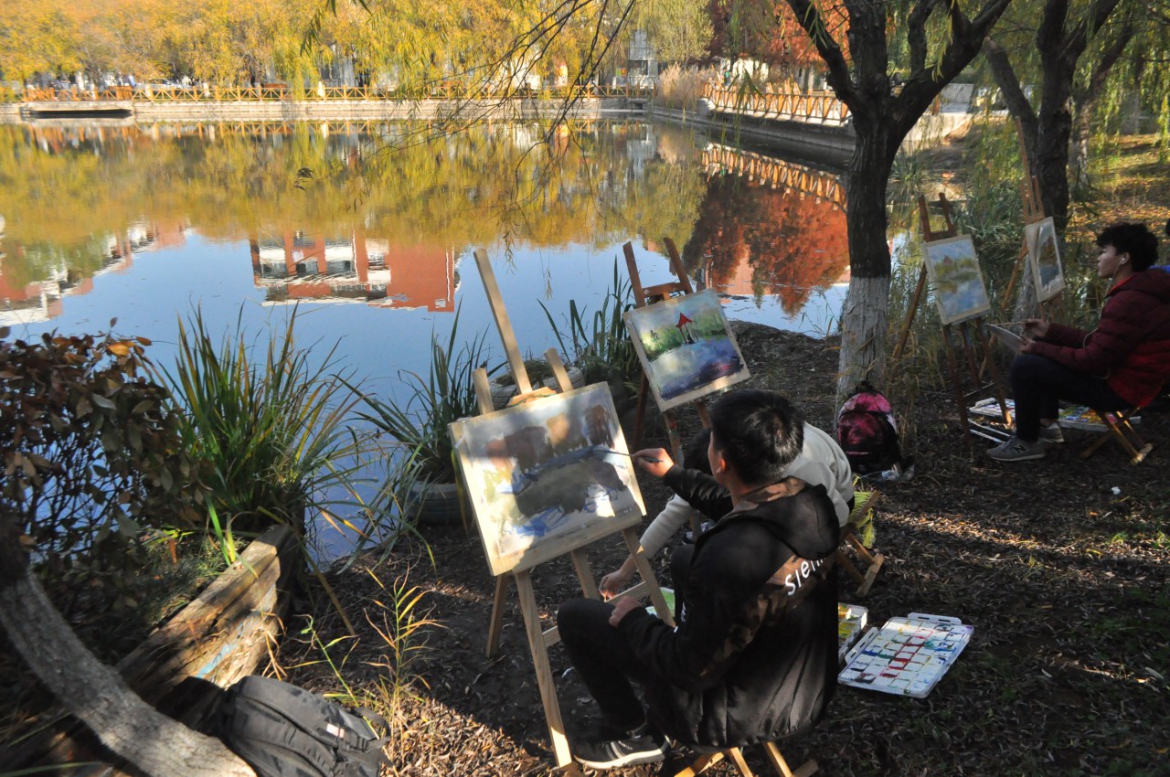 “雨侵坏瓮新苔绿,秋入横林数叶红”,山科的秋景美不胜收。此次活动聚集了60余名同学,共同描绘秋色宜人的美丽风光。比赛设置泰山广场、银杏大道、砚湖和若水园四处地点。比赛期间,参赛者们各显身手,有的用速写描绘着砚湖的美丽倒影,有的用水粉填充着银杏大道的灿烂秋景,还有的用素描记录着若水园的水波斑斓……同学们专注的创作,精湛的笔触,认真的构图,引得过路的同学、游玩的旅客纷纷驻足观赏。风格迥异的秋日风光展现在一幅幅画作上,透露了同学们对校园景色感悟的同时,也展示了我院学子对科大精神的继承和对科大的无限爱恋。