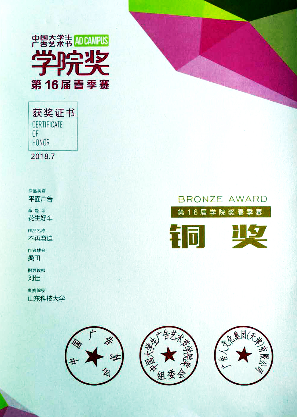 7月13日,第16届中国大学生广告艺术节学院奖春季赛颁奖盛典在北京梅地亚中心圆满落幕,本次大赛由中国广告协会主办、广告人文化集团承办、创意星球网全程执行。我院桑田同学的作品荣获“花生好车”命题铜奖,视觉传达设计系刘佳老师获优秀指导教师奖。