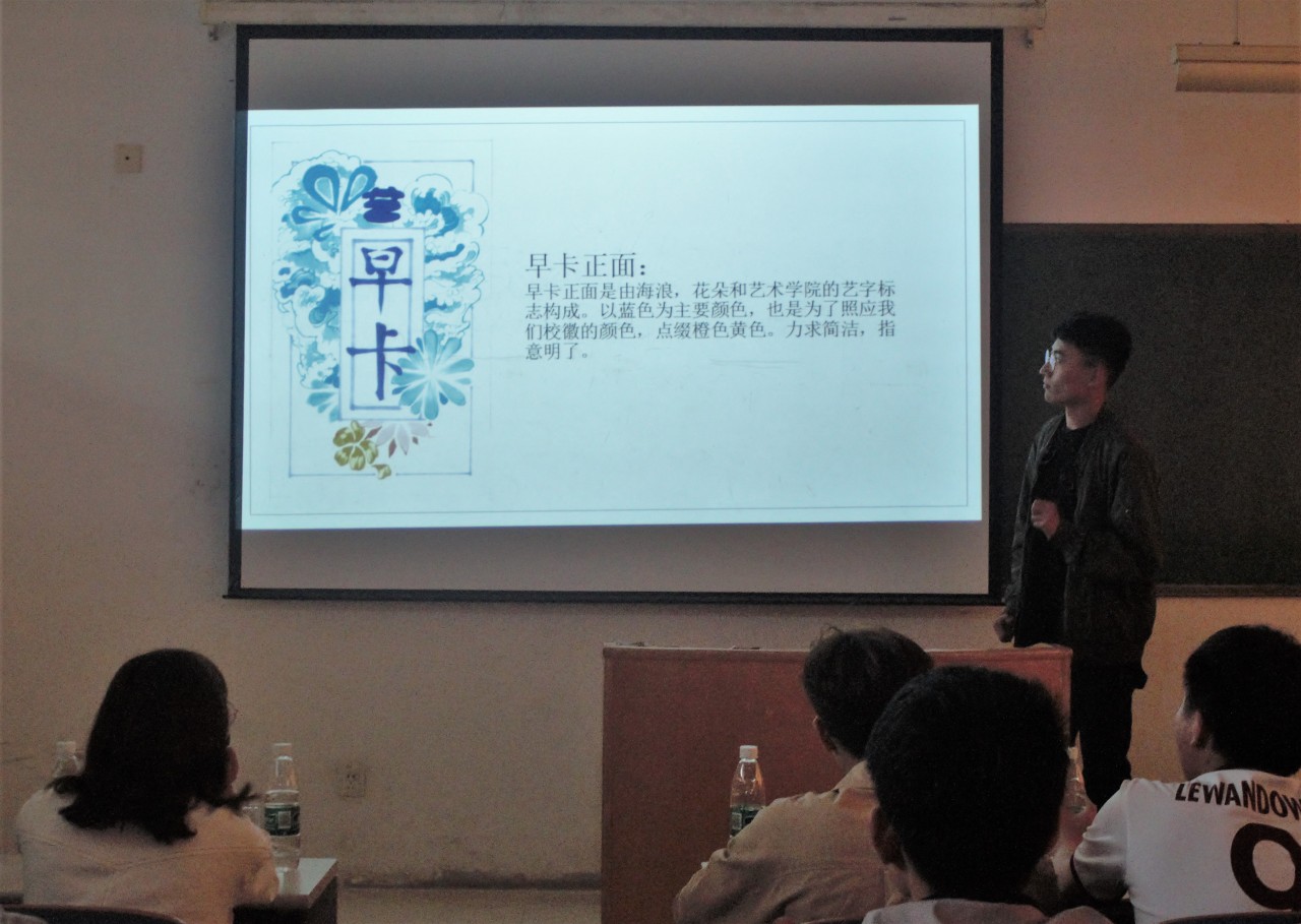本次大赛初赛和决赛两部分,初赛时间为4月28日至5月2日,经角逐,共有11位高人气选手进入决赛。决赛中,设计者需对自己的作品进行PPT创意讲解,由评委进行打分。优美华丽的背景音乐,独特新颖的创意,每张早卡都以其自身独有的吸引力展现给每位观众,评委们对每位参赛同学进行了认真点评。