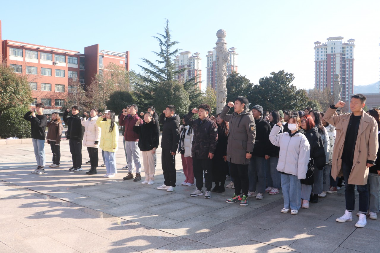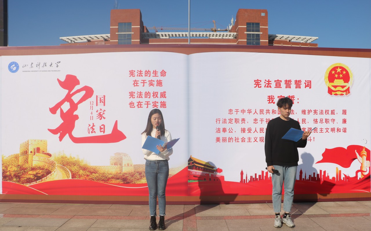 宪法日宣誓仪式于12月4日上午在泰山广场正式开始。活动伊始由2020级音乐系学生甄鑫和英旭进行了演讲,弘扬了宪法精神以及社会主义法治精神。随后,英旭带领全体同学进行宣誓:“我宣誓:忠于中华人民共和国宪法......为建设富强民主文明和谐美丽的社会主义现代化强国努力奋斗。”铿锵誓言,表达的是对法治的尊重,更是守护公平正义、强化责任担当的郑重承诺。