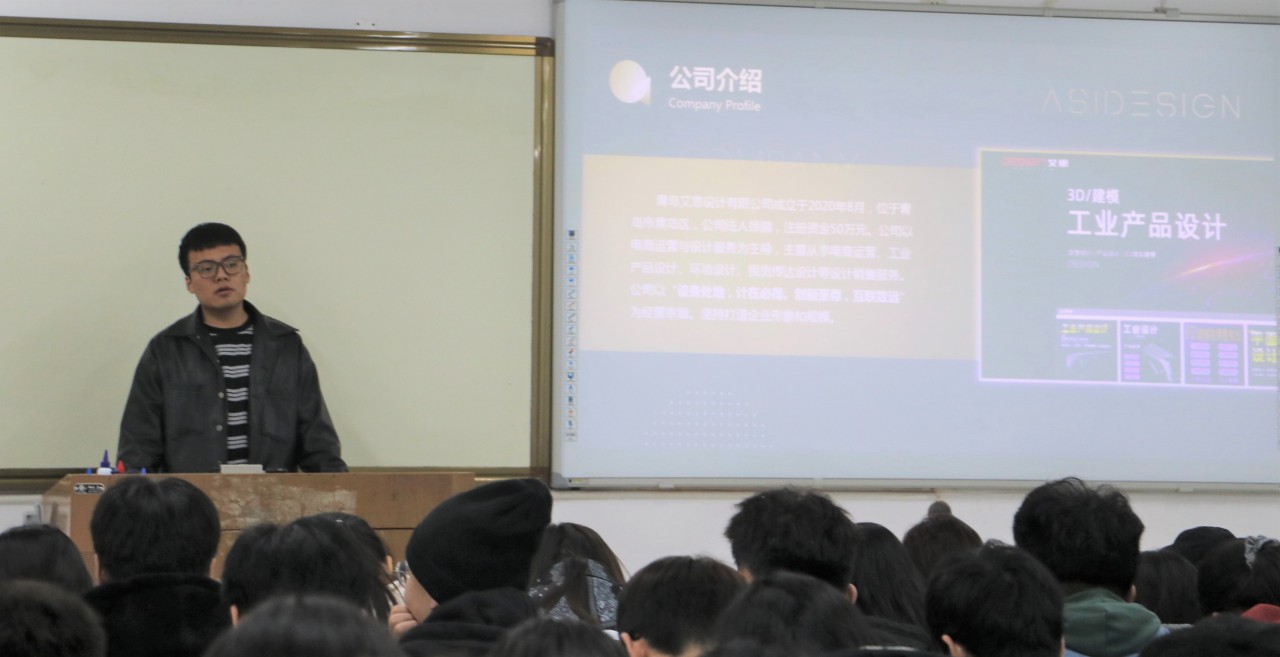宣讲会伊始,徐鹏介绍了所创办的青岛艾思设计有限公司的主要业务与运营情况,专业对口的岗位介绍立马吸引了同学们的关注。随后徐鹏以创业的思维与实践为线索,为同学讲解了互联网时代下工业设计与电商运营体系的建立与发展,并介绍了许多大学生创业成功的案例。最后,徐鹏就同学们提出的问题进行一一解答,以亲身经历传授了许多有关创业的知识与经验,并告诫同学们不要荒废大学的美好时光,要勇于探索实践。