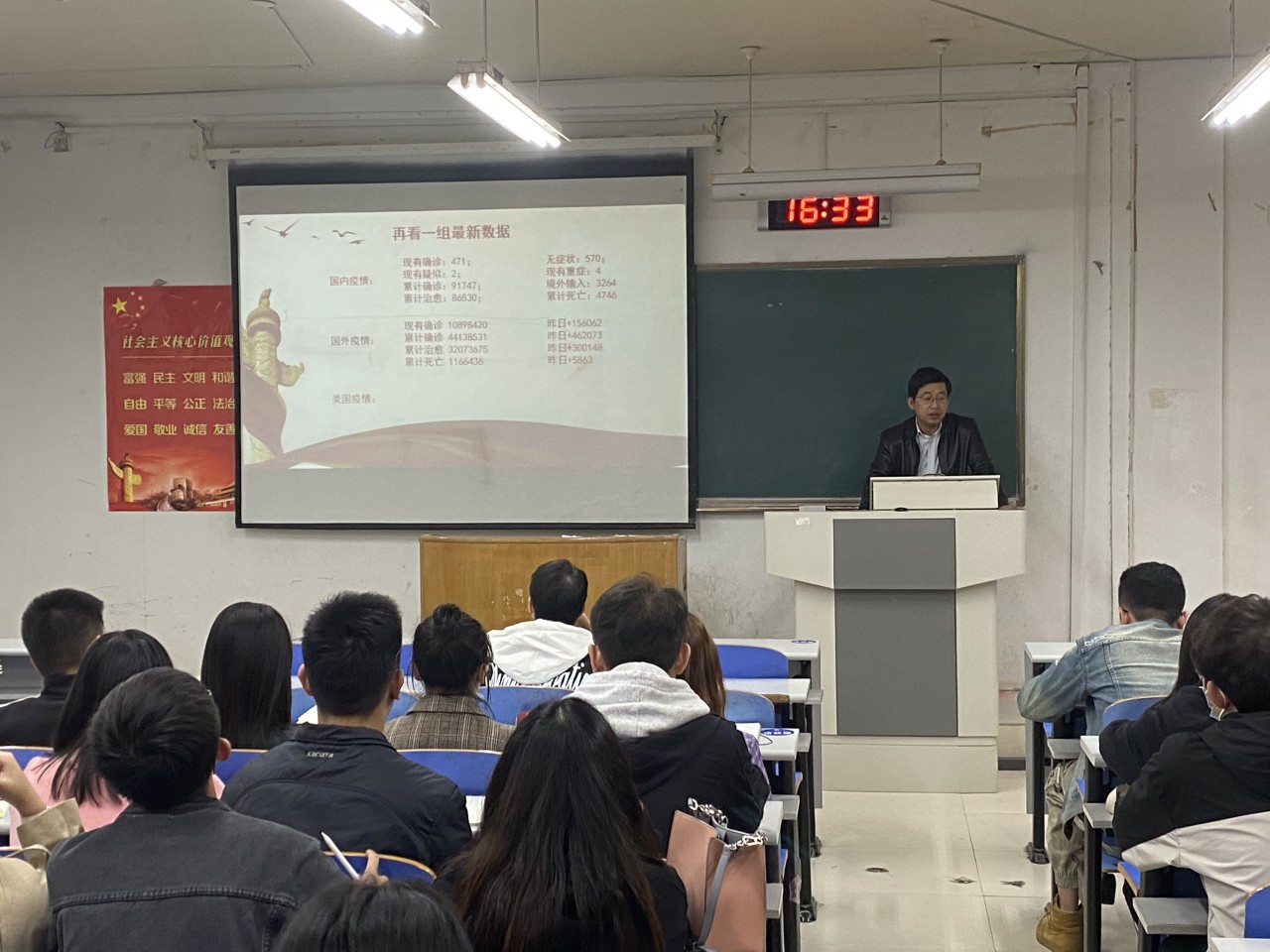 李建楠以新冠疫情中一张张照片、一组组数据为切入点,点明了中国共产党在疫情期间的重要作用,并用轨迹图追溯了党发展的伟大历程,阐述了是中国共产党带领中国人民实现民族的伟大复兴,走向世界舞台中央的深刻道理。随后李建楠采用通俗易懂的语言讲解了党的阶级性、先进性及群众性等基本性质,对中国共产党的性质做出了详细的解释,从为什么、怎么做两方面讲解了党的宗旨,强调要为中国人民谋幸福,为中国民族谋复兴是中国共产党人的初心和使命。之后李建楠介绍了共产社会主义的社会形式、党的兴国战略与新时代的显著特征,详细讲解了党的奋斗目标。最后,他鼓励同学们:路漫漫其修远兮,伟大事业并非一朝一夕。但是,我们要坚定信仰一步一个脚印,为着我们共同的理想砥砺前行!