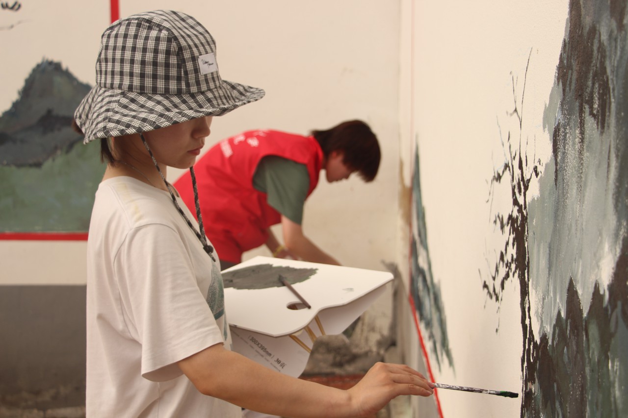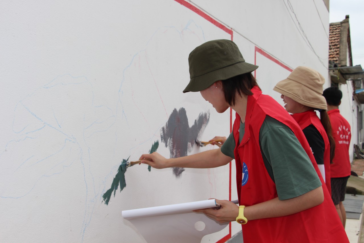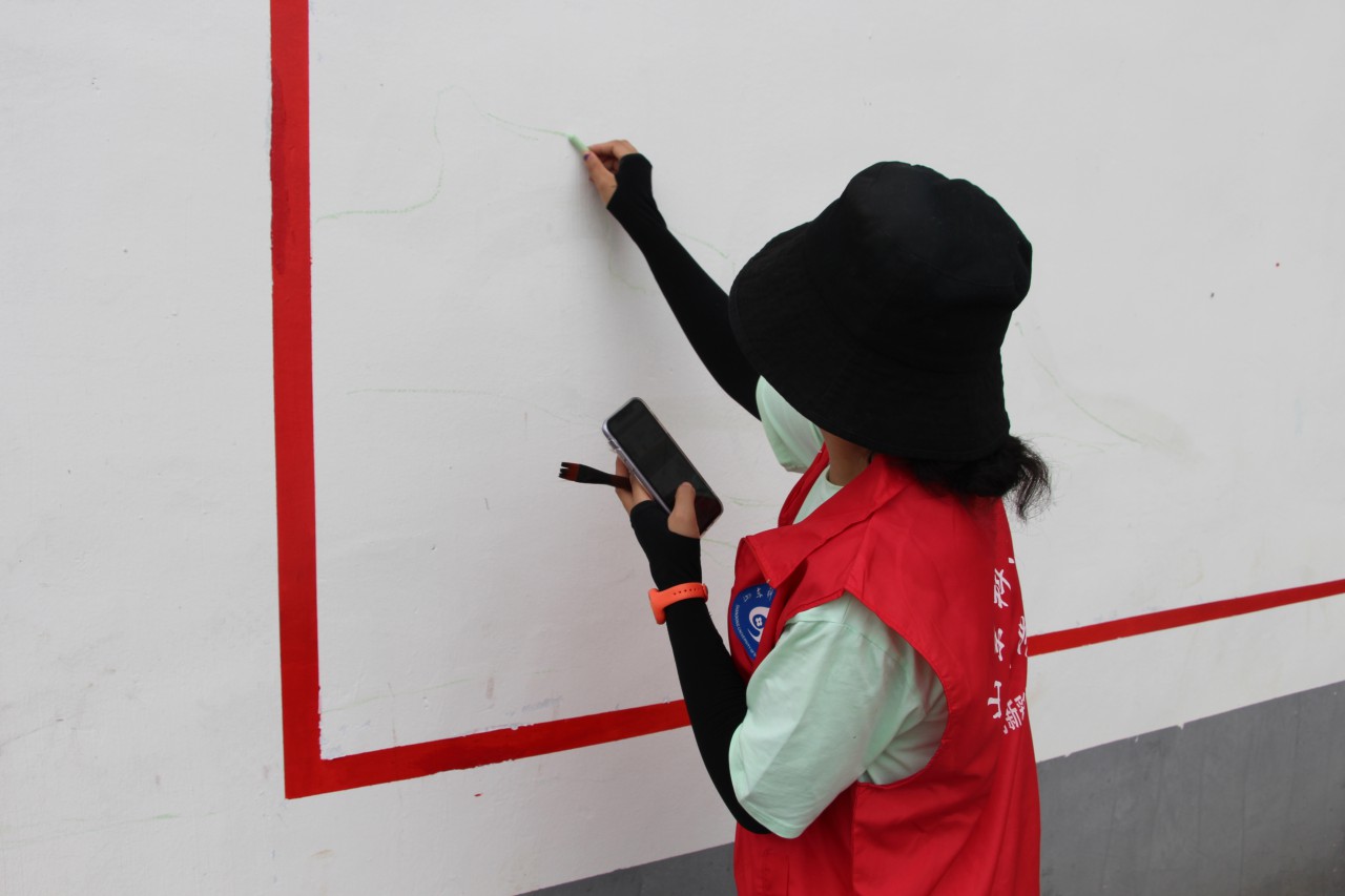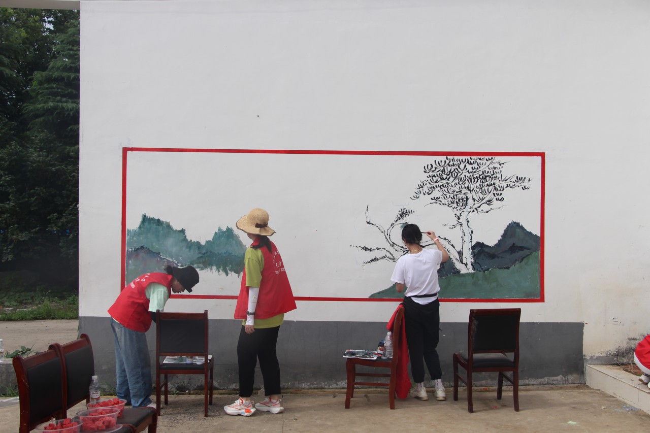 虽然烈日炎炎,但是依旧抵挡不住同学们画画的热情,衣服被汗水浸湿,双手也被颜料染脏,同学们还是没有放下手中的画笔,将自己的热情绘画在墙上,把美丽乡村建设的任务谨记心中。