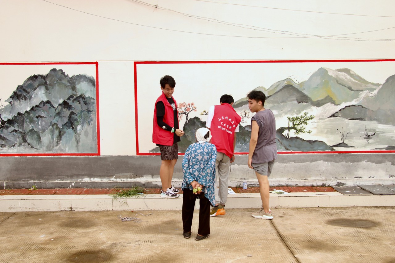 绘画过程中,我们遇到了一位89岁高龄的老奶奶,她看到我们的绘画跟我们聊了起来,向我们讲起啦村里的往事,在倾听的过程中我们了解啦柞城村的历史,同时向老奶奶介绍啦我们的墙绘,老奶奶流露出了慈祥的笑容并给予我们鼓励。