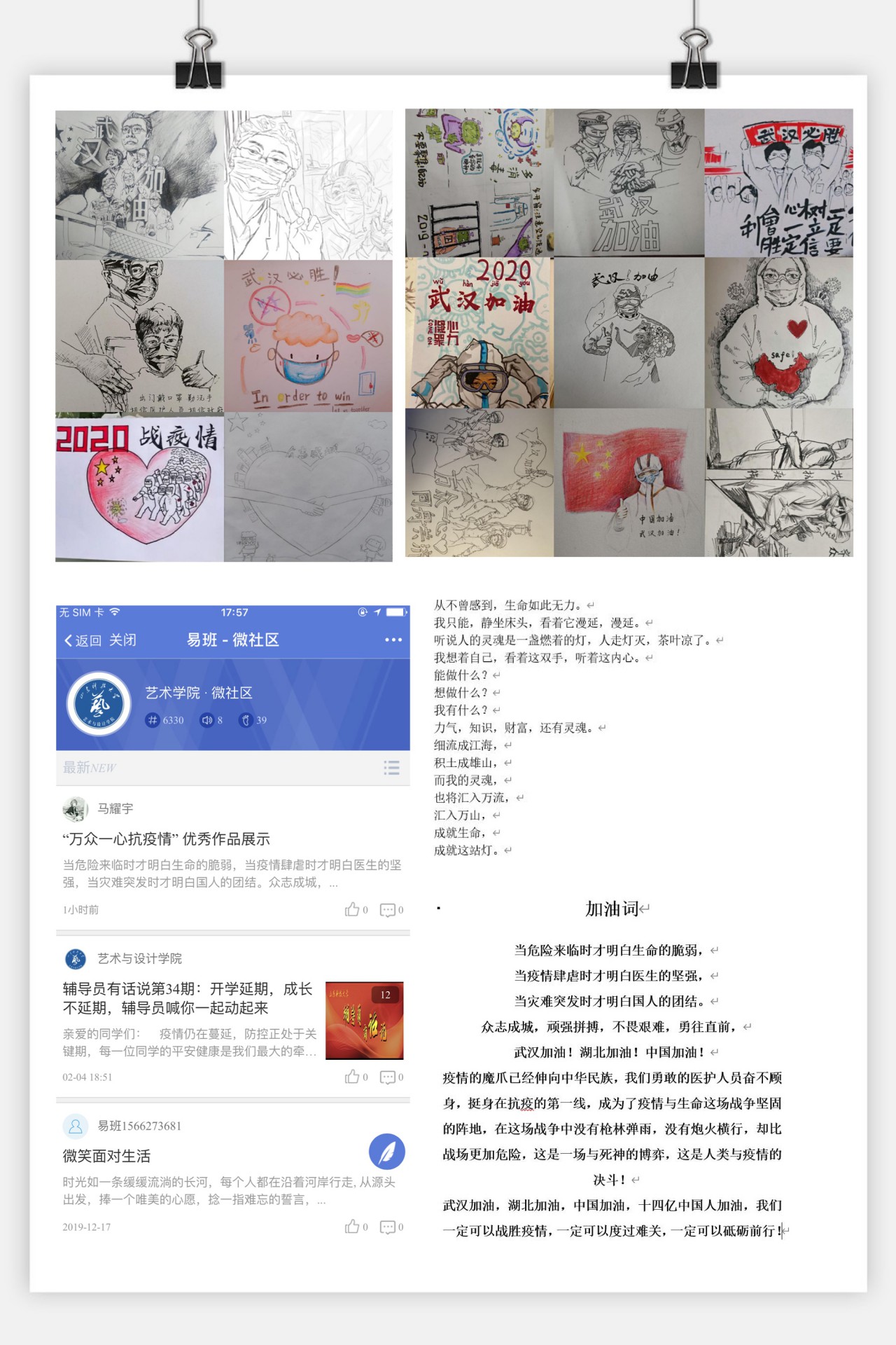学院微信公众号开设了“党员写生板”和“党员留声机”疫情防控专栏,鼓励学生依托专业优势,创作海报、漫画、视频、歌曲、作曲等各类艺术作品。这些作品通过宣传疫情防控相关知识、描绘疫情一线、火神山医院、疫情过程等多个角度的故事,用更深入学生心灵的方式宣传日常须知、歌颂真情大爱、致敬时代英雄、表达祝福力量、呼唤共克时艰,先后发表优秀推文7余篇,用色彩渲染真情,用旋律谱写坚守,在学生中聚起了同舟共济、抗击疫情的巨大能量。