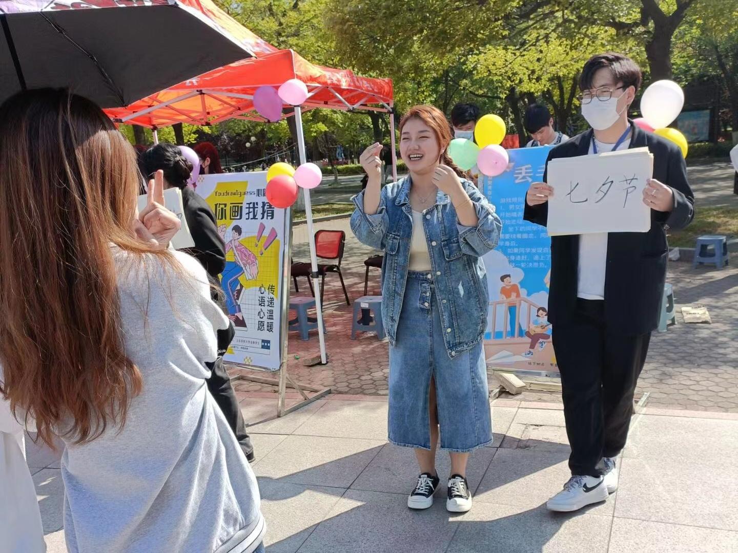 活动采用线上线下相结合的形式为山科学子带来丰富有趣的活动。线下活动种类繁多,“你比划我猜”环节使同学们手脑并用,比划的同学用丰富的肢体动作提示所示词语,滑稽逗乐的表情让在场观众都忍俊不禁。接下来的“众志成城”环节不仅考验团队的协作能力,更挑战队员之间的默契程度,每支队伍为赢得胜利各显神通。最后的“丢手绢”游戏环节大家一起牵手唱歌,在明媚的阳光下你追我赶,现场的欢笑声余音绕梁,共同勾起了儿时的美好回忆。
