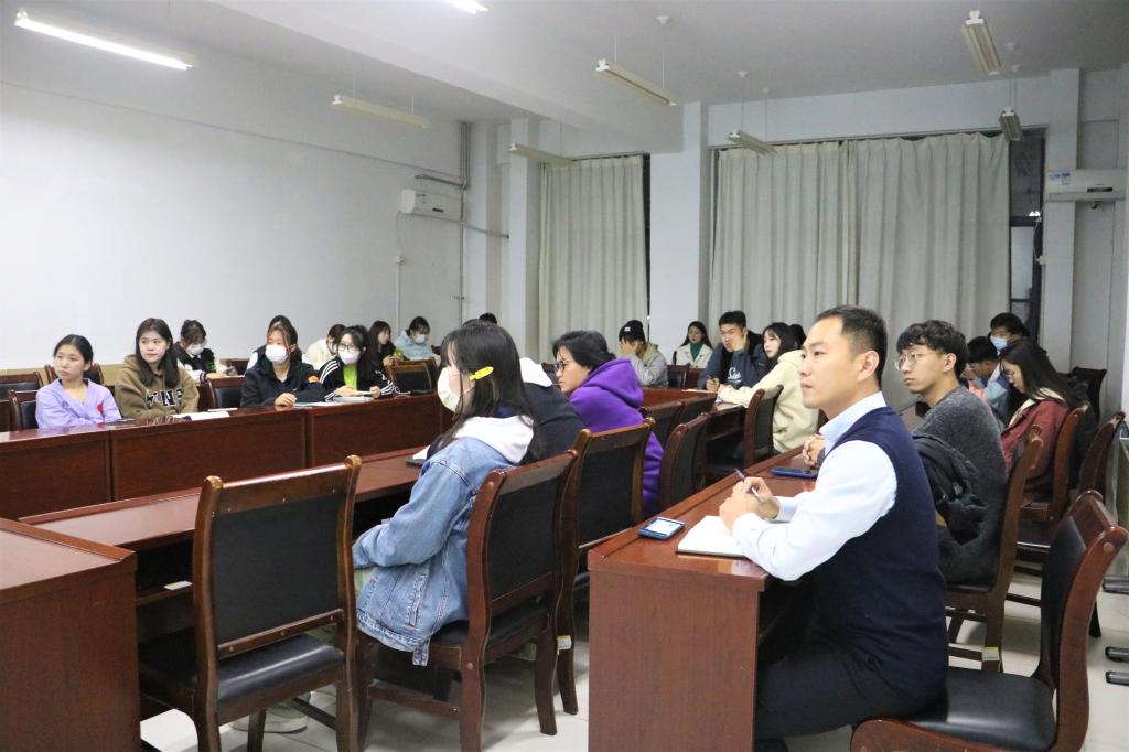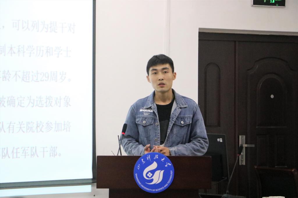 吴胜发同学从征兵时间、入伍条件、支持政策等方面为同学们详细讲解了大学生入伍参军政策,重点为同学们讲解了目前国家在入伍大学生考研、就业、学费减免方面的支持政策,并与有入伍意向的同学现场交流,为同学们解疑答惑。