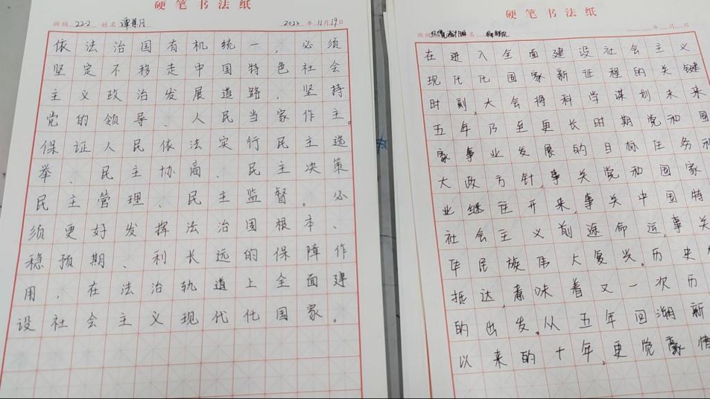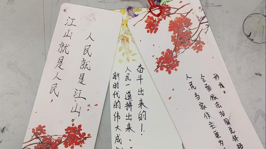 活动首先为同学们分发信纸、书签,和签字笔,让同学们挑选有关党的二十大的优秀金句进行摘抄。大家将书法和党的二十大的优秀精神结合起来,用硬笔书写的方式深学、细悟、笃行马克思主义及其中国化时代化的创新成果。在摘抄的过程中,大家表现积极,字体娟秀。所摘抄的金句中有的关于新时代青年人的勇做敢担当精神,有的关于国家统一、民族复兴滚滚向前,有的关于抵制腐败吹响冲锋号角,都充分体现了对党的二十大深刻的理解。活动最后,负责人将摘抄完的金句进行收集,挑选优秀作品赠与同学们作为收藏纪念。并以此鼓励大家努力成长为有理想、敢担当、能吃苦、肯奋斗的新时代好青年。