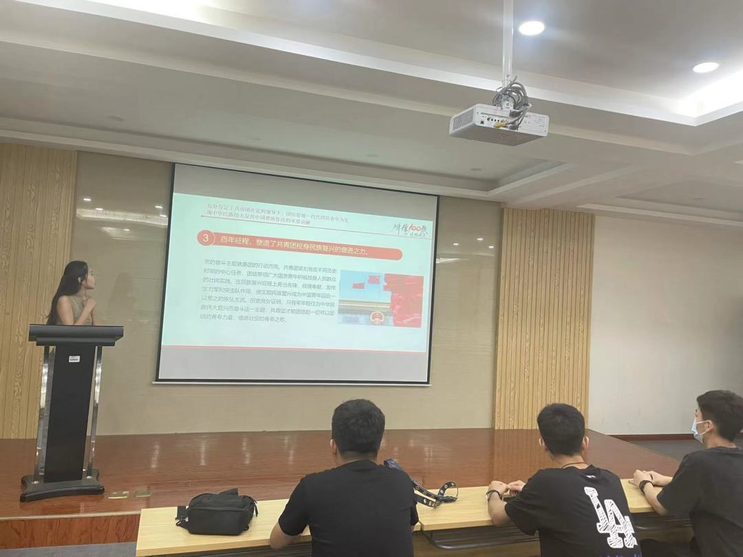 首先,负责人杨淼播放了习近平主席在庆祝中国共产主义青年团成立100周年大会中重点部分的视频,让同学们牢记习近平主席对青年和共青团提出希望,郭琪同学做重要讲话的金句摘录。经讨论,大家总结出习近平主席的重要讲话分为以下五个部分:全面回顾了100年来共青团坚定不移听党话、跟党走的青春历程;充分肯定了共青团在党的领导下、团结带领一代代团员青年为实现中华民族伟大复兴的中国梦所作出的贡献;深刻阐明了共青团和青年工作的历史经验;对当代青年寄予殷切期望;对做好新时代共青团工作提出明确要求。活动最后,负责人杨淼说道:新时代的中国青年,生逢其时、重任在肩,施展才干的舞台无比广阔,作为新时代的青年,我们要牢记国家交给我们的重任,跟随党的步伐,努力为实现中华民族伟大复兴做出自己的贡献!
