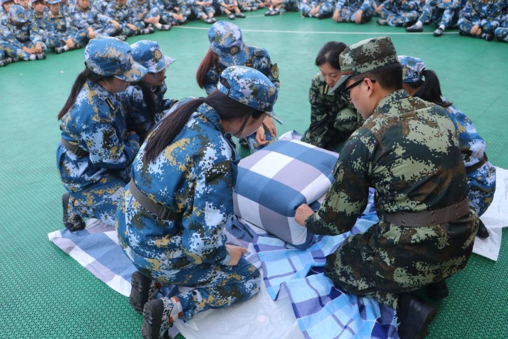 同学们在教官的带领下开展了内务整理规范的学习。教官们现场示范了如何进行被褥叠放,并一边示范一边讲解要领。一床蓬松的棉被就在简单的“叠、压、捋”几个动作之下,变成了四四方方的“豆腐块”。随后,教官们请同学们积极展示学习成果,同学们踊跃报名,对于同学们提出的有关疑问,教官们也进行了耐心细致的讲解,在教官的指导下,同学们手中的棉被逐渐变得棱角分明,表面平整如新。教官对于同学们的学习成果给予了极大肯定。