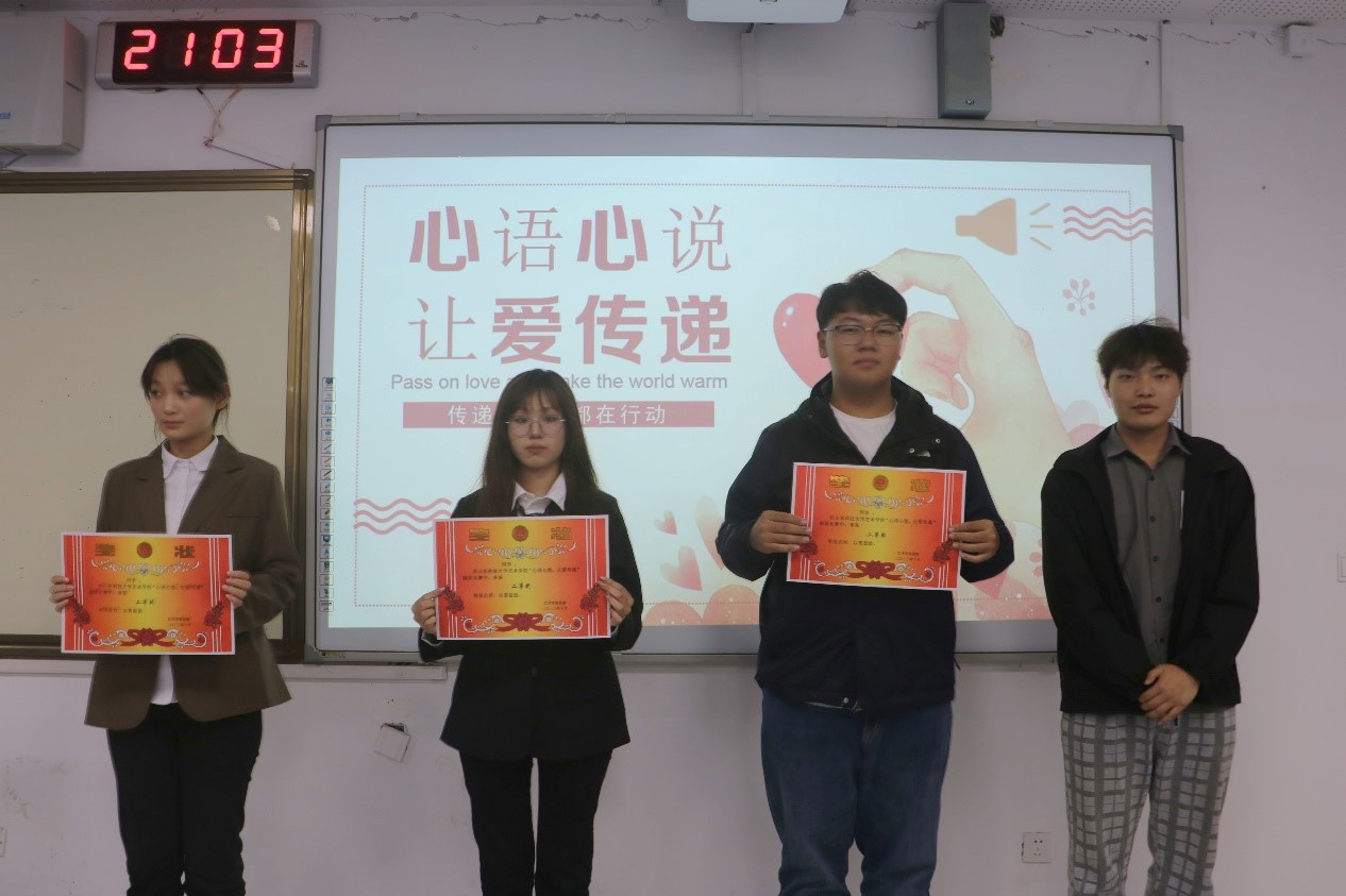 比赛现场,选手们用自己的想法、事迹,真切地传播弘扬了健康心理与爱同行。15位选手各显其能,有“保持积极心态,传递爱的力量”的周雪如同学,有“我身向阳,绽放青春”的高俊同学,有“倾听心声,与爱同行”的梁璐同学,有“健康心灵,与爱同行”的田泽宇同学,有“健康心理,阳光人生”的贺子婷同学。风趣的语言、感人的故事、崇高的精神,感染着在场的每一位观众。现场气氛热烈,台下掌声不断。同时,各位评委根据评分细则严格为每一位选手亮分,并从主题立意、演讲结构、事例引用、表达感染力等方面进行了点评,对参赛选手给出了意见建议。经过激烈角逐,周雪如、高俊同学获一等奖;梁璐、田泽宇、贺子婷同学获二等奖;祁可嘉、孔舒葶、王昊瑛、蒋文硕同学获三等奖;刘水苗、孙睿、李馨玥、陈梦茹、刘阳、刘梓轩同学获优秀奖。