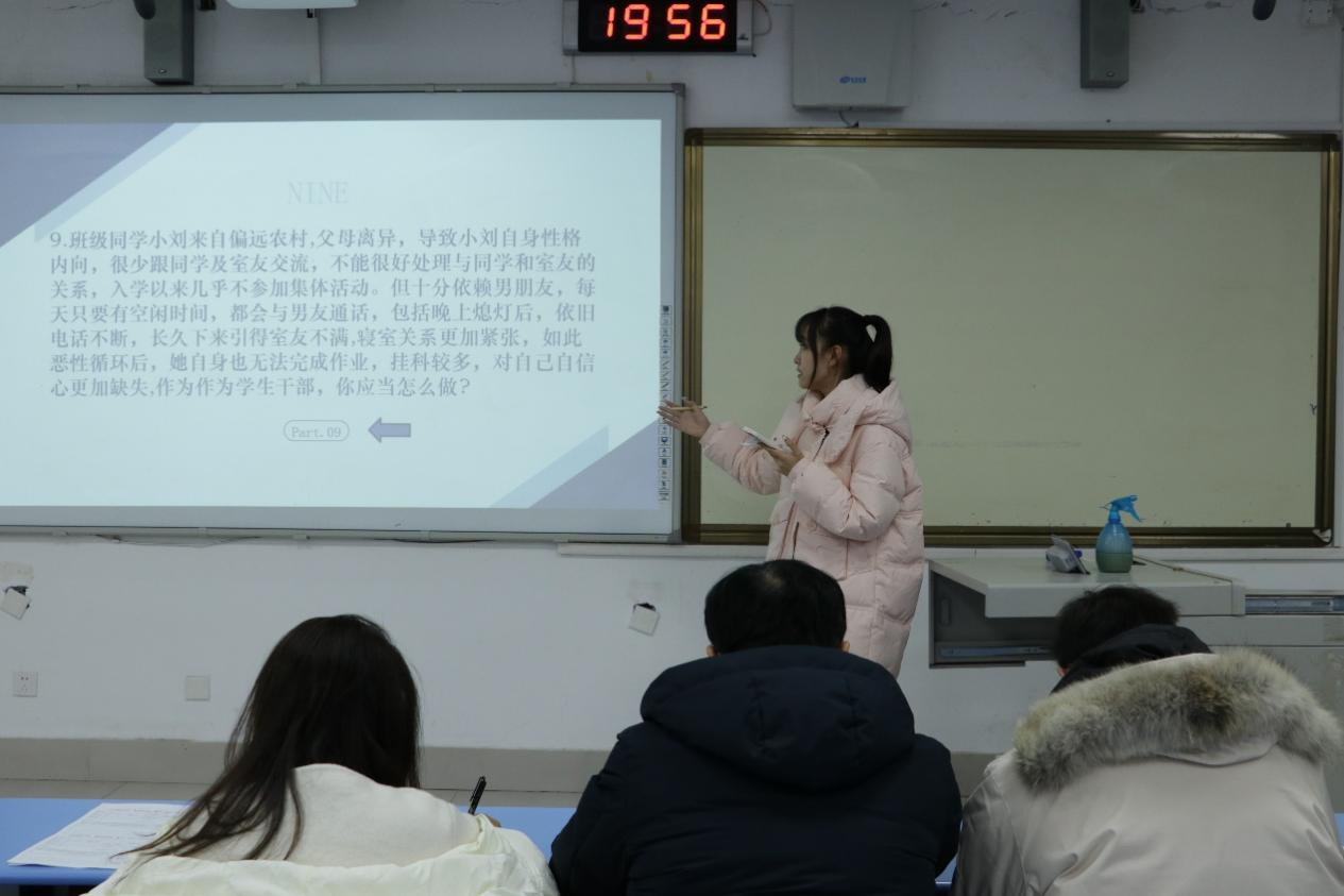 竞赛开始,每组参与竞赛的代表逐个上台,案例分析内容就学生心理健康、思想理论教育和价值引领、学生日常事务管理等问题进行展开探讨。现场分析过程中,既有“学生遇电信诈骗而寻求班委帮助”等学风建设主题的题目,又有“学生因作息不同而与舍友产生矛盾”的学生日常事务管理问题案例。各队伍代表由点及面,由个别到一般,从容不迫地对题目进行深刻剖析。各代表结合生活实际和题目中所提供的心理情境,亮明观点,分析案例中人物心理异常的原因和人物周围环境,对此进行解答及提供有效帮助意见。比赛结束,各评委对各支队伍表现进行评比打分,本次竞赛获得前三名的分别是一组、十组和三组。