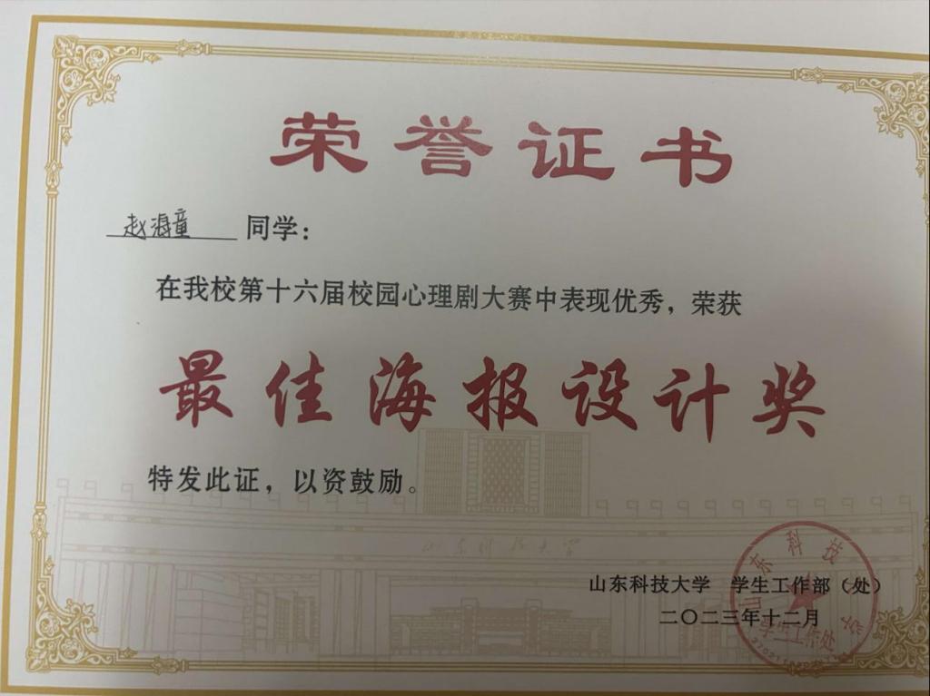 环境设计2023-1班赵海童同学荣获第十六届“阳光健心,青春圆梦”校园心理剧大赛最佳海报设计
