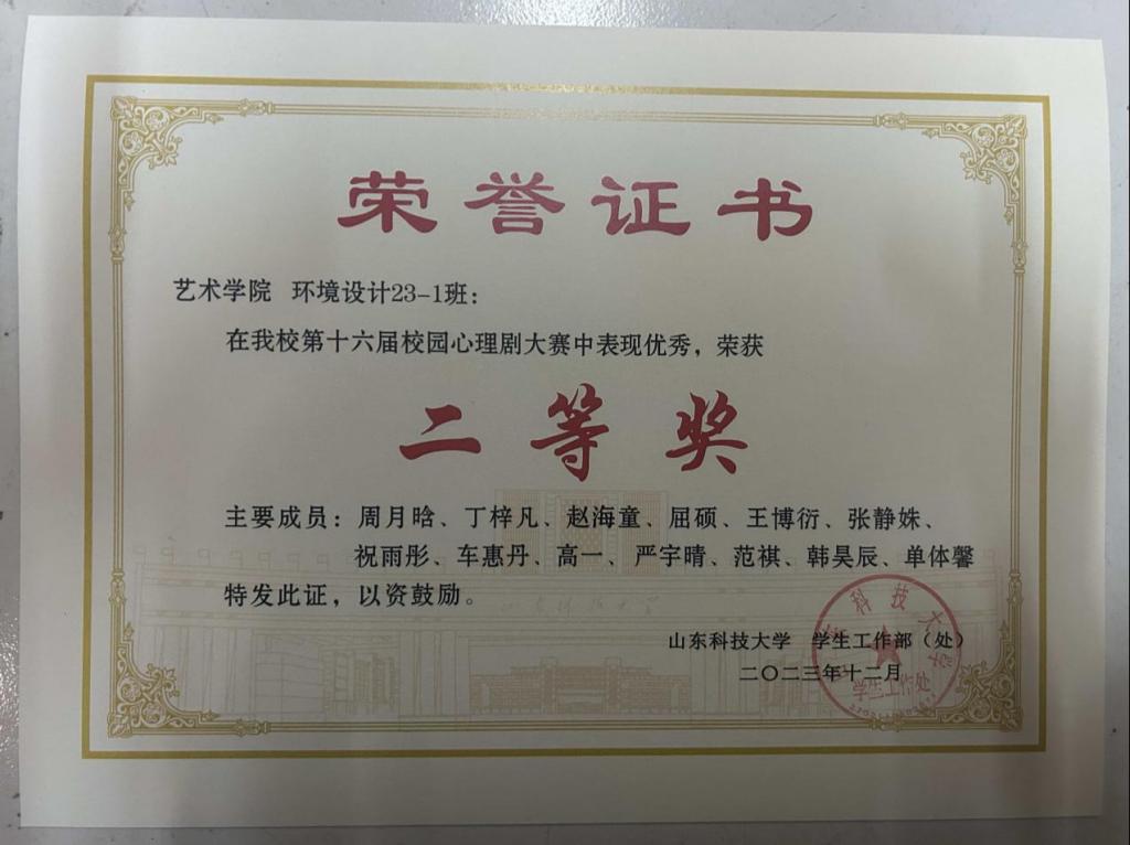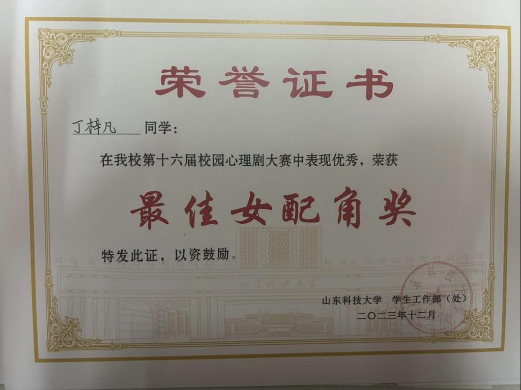 环境设计2023-1班丁梓凡同学荣获第十六届“阳光健心,青春圆梦”校园心理剧大赛最佳女配角