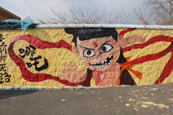 志愿者们以春节档电影《哪吒2》中的中国传统神话人物“哪吒”为核心元素展开艺术创作。活动前期团队通过实地勘察、测量墙体数据,精准计算比例及用料,制定墙绘进度安排。墙绘绘制开始,志愿者们通过精准起形定位主体轮廓,确立哪吒动态造型与场景构图。随后,他们运用环保丙烯颜料由浅至深逐层渲染,确保色彩过渡自然和持久性。最后志愿者们进行精细刻画,通过混天绫纹样勾勒等细节的刻画,使神话人物跃然墙面。经过一天的时间,原本单调朴素的墙面蜕变为色彩绚丽的艺术作品,漂亮的墙绘引得众多居民前来驻足观赏。居民们纷纷表示,墙绘不仅提升了社区环境美感,更感受到志愿者们为街道建设注入的文化活力,纷纷为这份艺术贡献点赞。