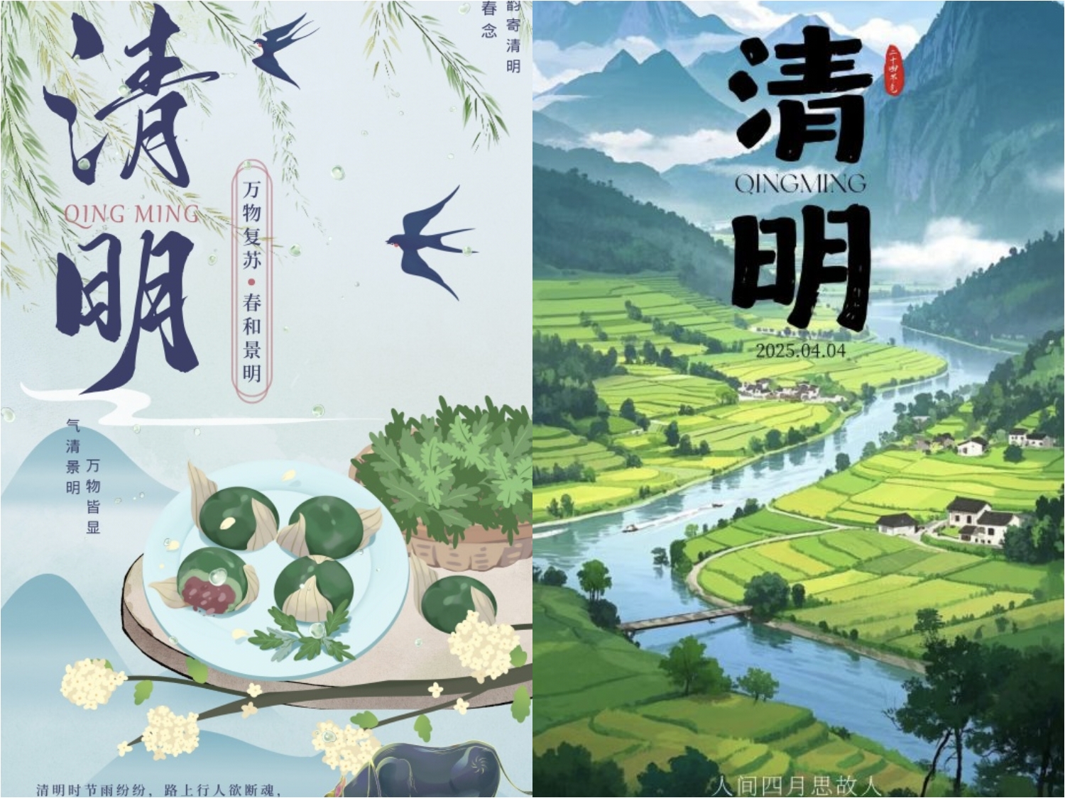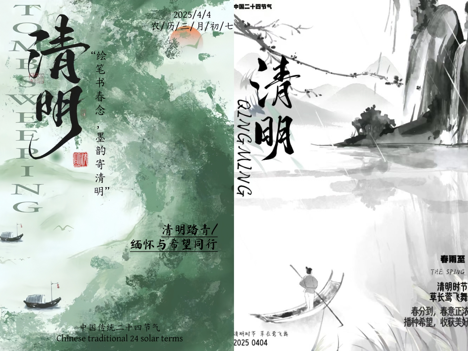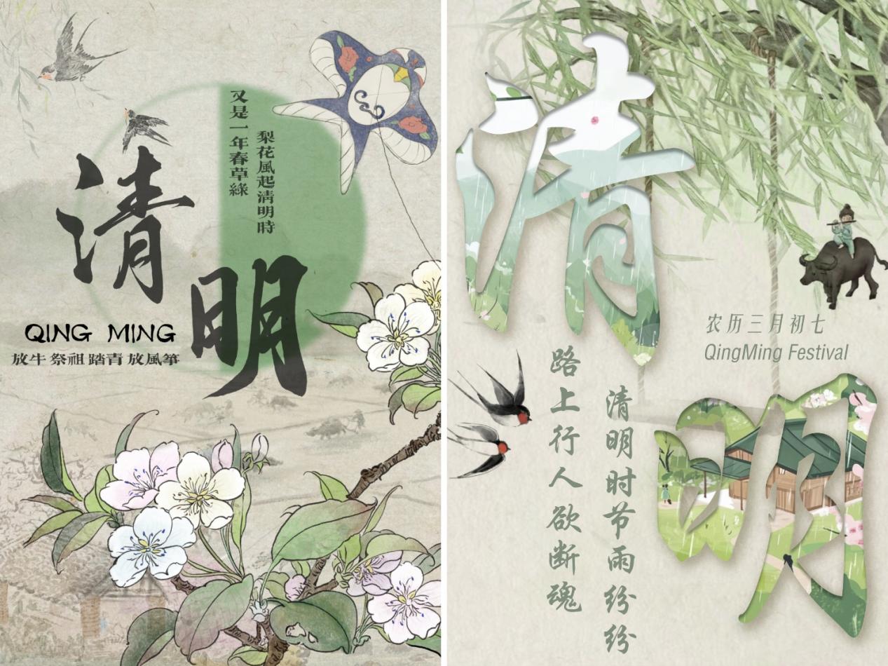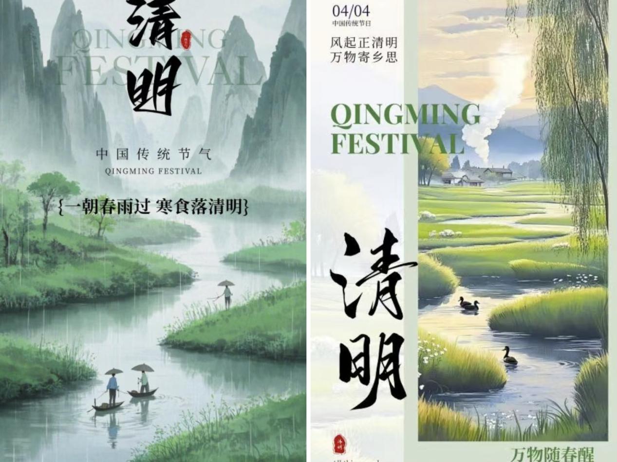 此次活动紧扣清明节的特点,巧妙融合春天的蓬勃生机与清明追思的深沉情感。在此次比赛作品中,其中一幅海报以朦胧山水为背景,于烟雨中绘有撑伞划船、垂钓之人,配上“一朝春雨过 寒食落清明”的文案,尽显清明时节承接寒食、春雨润泽的特点;一幅则展现春日田园之景,蜿蜒河流、游动鸭子、依依垂柳与袅袅炊烟相互映衬,呈现出清明万物复苏的蓬勃生机。参与此次活动的学生蒋文硕表示,创作让她深入理解清明文化,提升专业技能,对传统文化更生敬意,以后会更积极参与此类活动。
